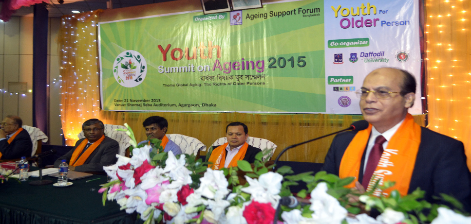 The first Youth Summit on Ageing was held on 21 November 2015 at Shomajsheba Auditorium, Agargaon with the theme “Global Ageing: The Right of the Older Person”. The gala event was organized by Ageing Support Forum, a youth group of age-care and support in Bangladesh. The