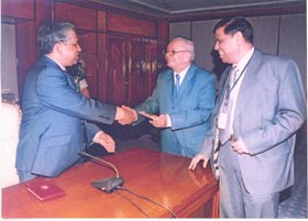 Vice Chancellor Prof. Dr. M. Aminul Islam and Advisor Prof. Shahjahan Mina handed over cheque as financial donation to the Chief Advisor Dr. Fakhruddin Ahmed for Flood Relief Fund in 2007.