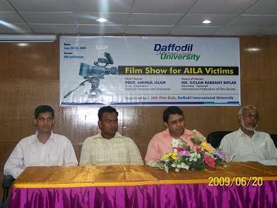 JMC Film Club of DIU organized a film show to help Aila Victims on June 20, 2009. Mr. G. Rabbany Biplab, Secretary General, International Federation of Film Society was present at the inaugural ceremony as guest of honor. DIU Registrar Professor Mizanur Rahman, Head of ETE Department Professor GM Choudhury and Head of the Department of JMC Mr. Md. Shahid Ullah were also present.