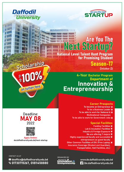 “Are You the Next Startup?” is a national level talent hunt program introduced to find out potential startups and entrepreneurs of Bangladesh. It will hunt, groom, design, organize, and manage new enterprises or business ideas till the ultimate success of each winner. The unique feature of “Are You the Next Startup?” is 4-years graduation program for the winners. After an intensive research we found seed startups are not growing only because of lack of knowledge and guidance. Here in this unique platform amateur entrepreneurs will be trained and graduated under the Department of Entrepreneurship at Daffodil International University for learning by doing. Potential and promising winning entrepreneurs will be awarded up to 100% scholarship for this 4-years graduation for practical and theoretical learning which will transform them into successful entrepreneurs within four years of their graduation. In addition, each and every student under this project will earn seed money to start new business during graduation that will confirm their involvement in the business sector. This project is to create entrepreneurs in the real sense and job opportunities for the huge unemployed educated population in the country that will contribute directly to increase GDP.