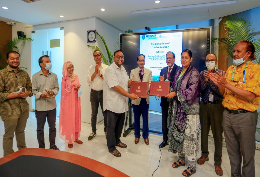 The memorandum of understanding (“The Memorandum”) has been signed on July 04, 2022 by and between Department of Nutrition and Food Engineering (NFE) under the Faculty of Allied Health Sciences, Daffodil International University; Daffodil Smart City, Dhaka 1207, and Human Development Research Centre (HDRC); House no. 05, Road no. 08, Mohammadiya Housing Society, Mohammadpur, Dhaka.