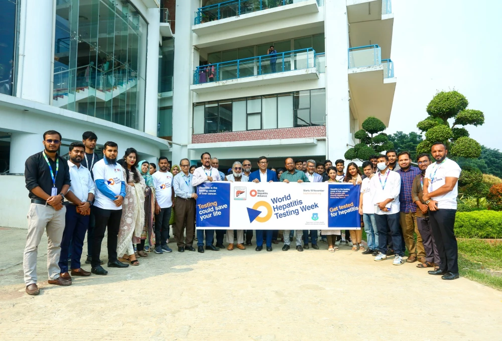 The day began with an enthusiastic rally led by Professor Dr. Md. Bellal Hossain, the honorable Dean of the Faculty of Health and Life Sciences, DIU. Participants included Professor Dr. Mohammad Ali, a renowned hepatobiliary-pancreatic surgeon and the founder of NLFB; Dr. Abu Jamil Faisel, President-Elect of the Public Health Society; Professor Dr. ABM Alauddin Chowdhury, Head of the Department of Public Health at DIU; along with other faculty members, students, and staff of DIU. The rally started from DIU’s Knowledge Tower and ended at Bonomaya, where over 100 participants joined hepatitis screening activities.