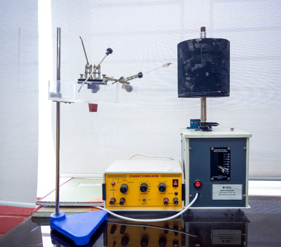 Physiology and Pharmacology Lab utilizes specialized instruments—such as microscopes, Electrocardiograph (ECG/EKG), and spectrophotometer systems—to study biological functions and drug effects. These tools enable precise analysis of cellular interactions and are essential for advancing pharmacological research.