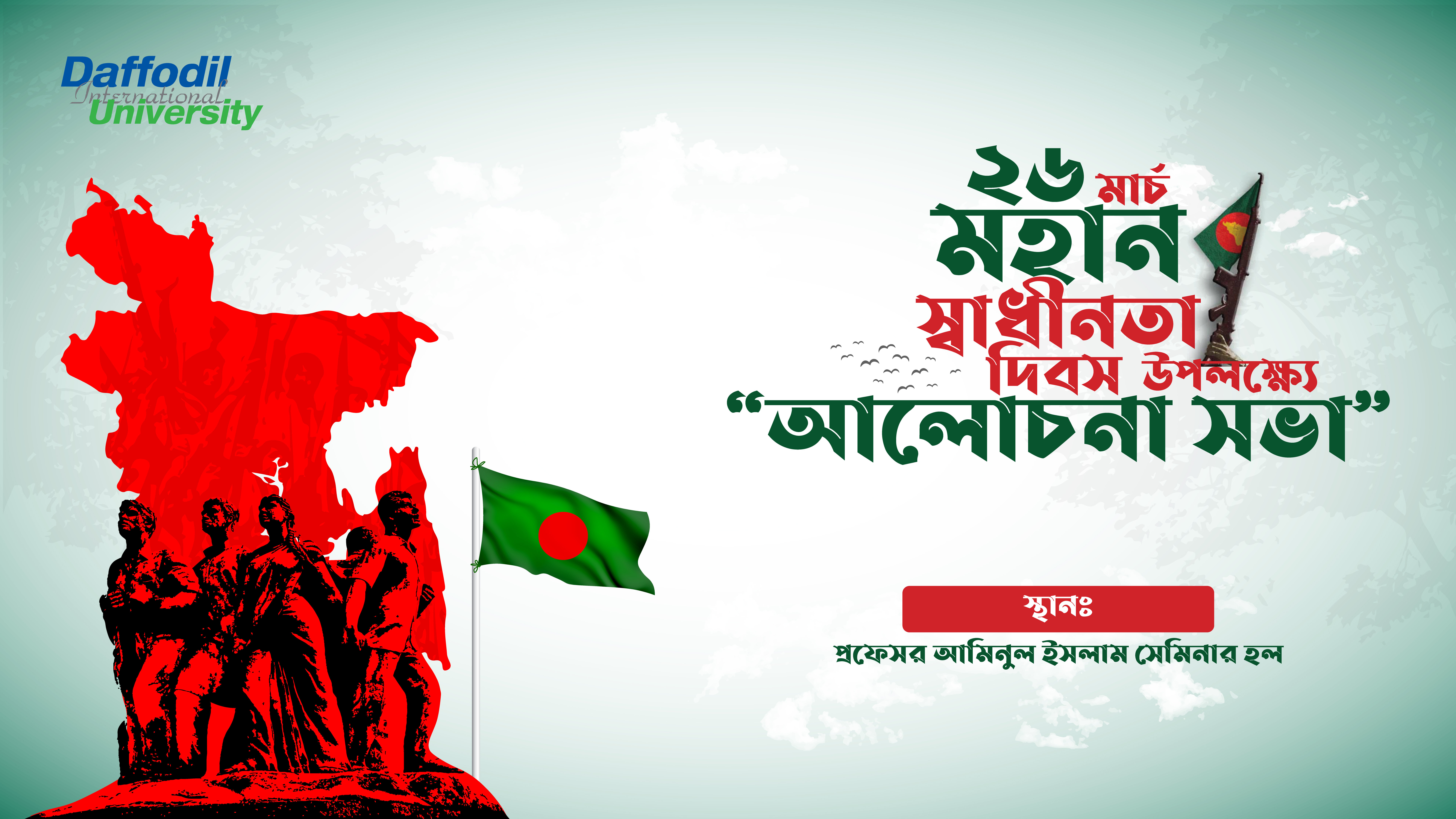 মহান স্বাধীনতা দিবস-২০২৪ উপলক্ষে ড্যাফোডিল ইন্টারন্যাশনাল ইউনিভার্সিটিতে এক আলোচনা সভা আজ ২৫ই মার্চ ২০২৪ তারিখ সকাল ১০ঃ০০ ঘটিকায় প্রফেসর ড. আমিনুল ইসলাম সেমিনার হলে অনুষ্ঠিত হবে। উক্ত সভায়, সভাপতি হিসেবে উপস্থিত থাকবেন বিশ্ববিদ্যালয়ের কোষাধ্যক্ষ ড. হামিদুল হক খান।